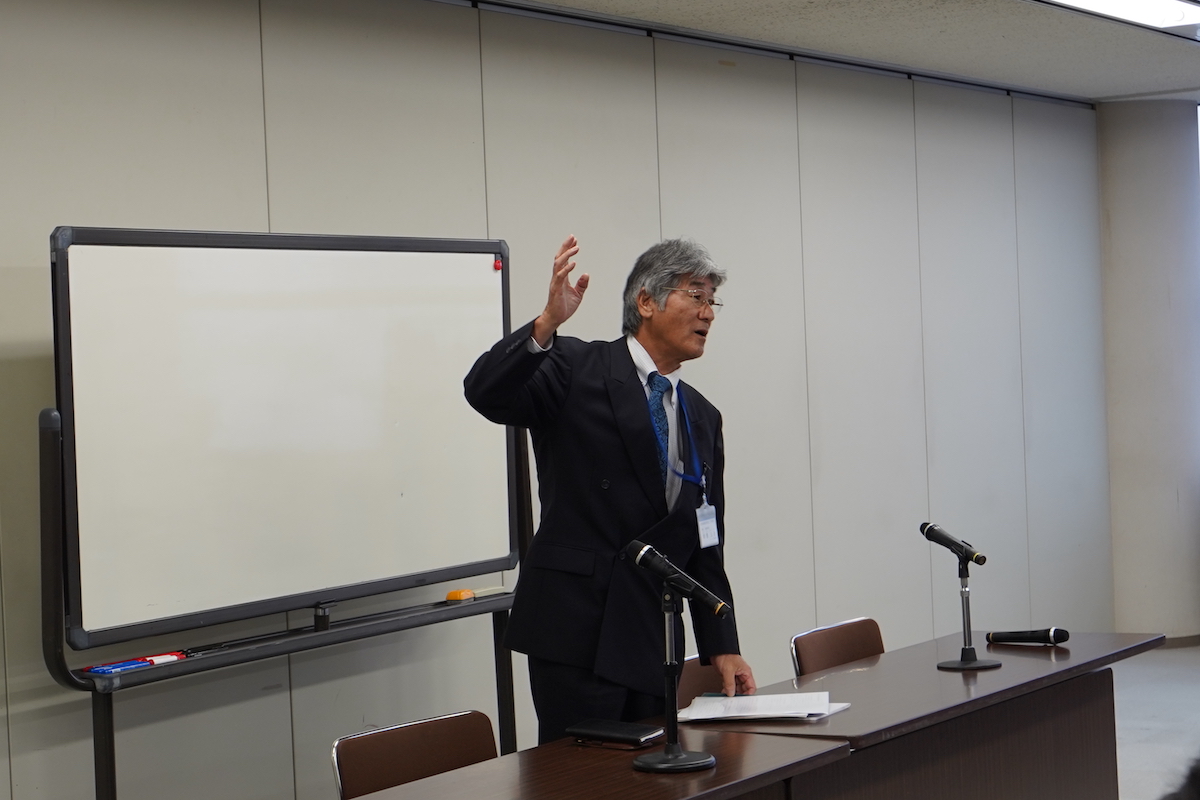 【講演をする世話人の朝倉氏】