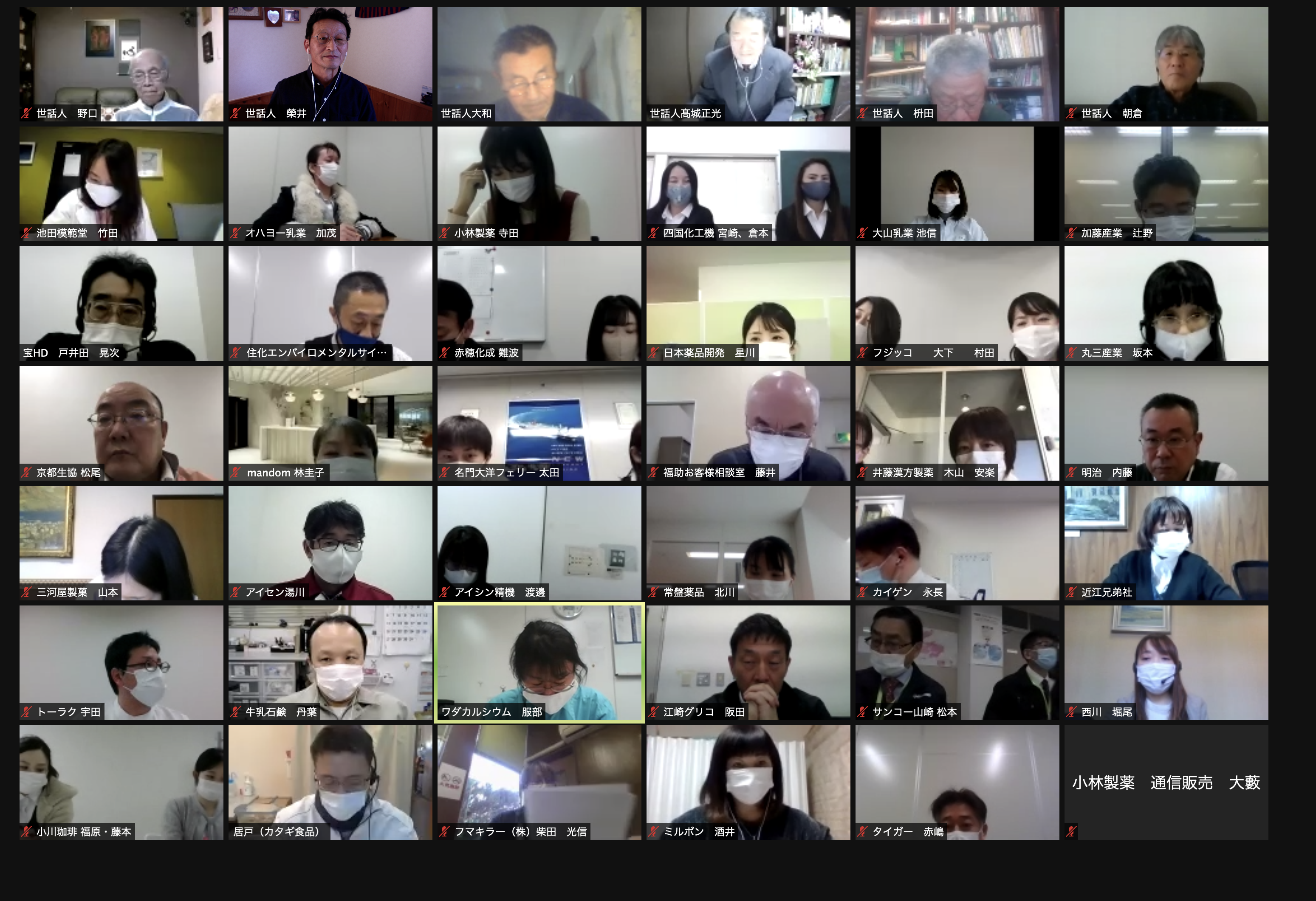 第107回事例研究会をオンラインにて開催しました 2020年12月16日 第107回の事例研究会をオンラインミーティングにて開催いたしました。 参加は37社46人でした。 事例の発表は 赤穂化成株式会社 ワダカルシウム製薬株式会社 の2社でした。 【107回事例研究会の参加者のみなさま】 【事例を発表する赤穂化成株式会社の難波様と根津様 【事例を発表するワダカルシウム製薬株式会社の服部様